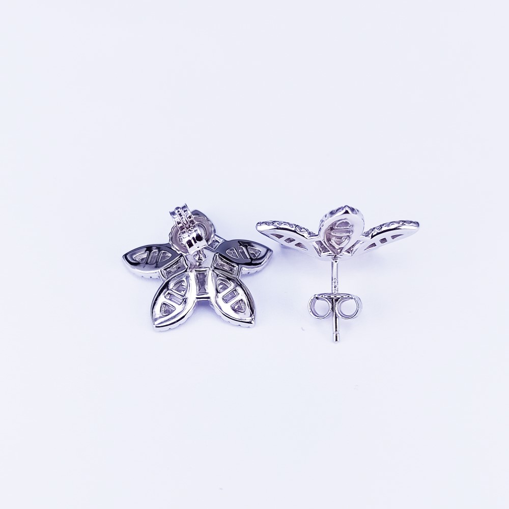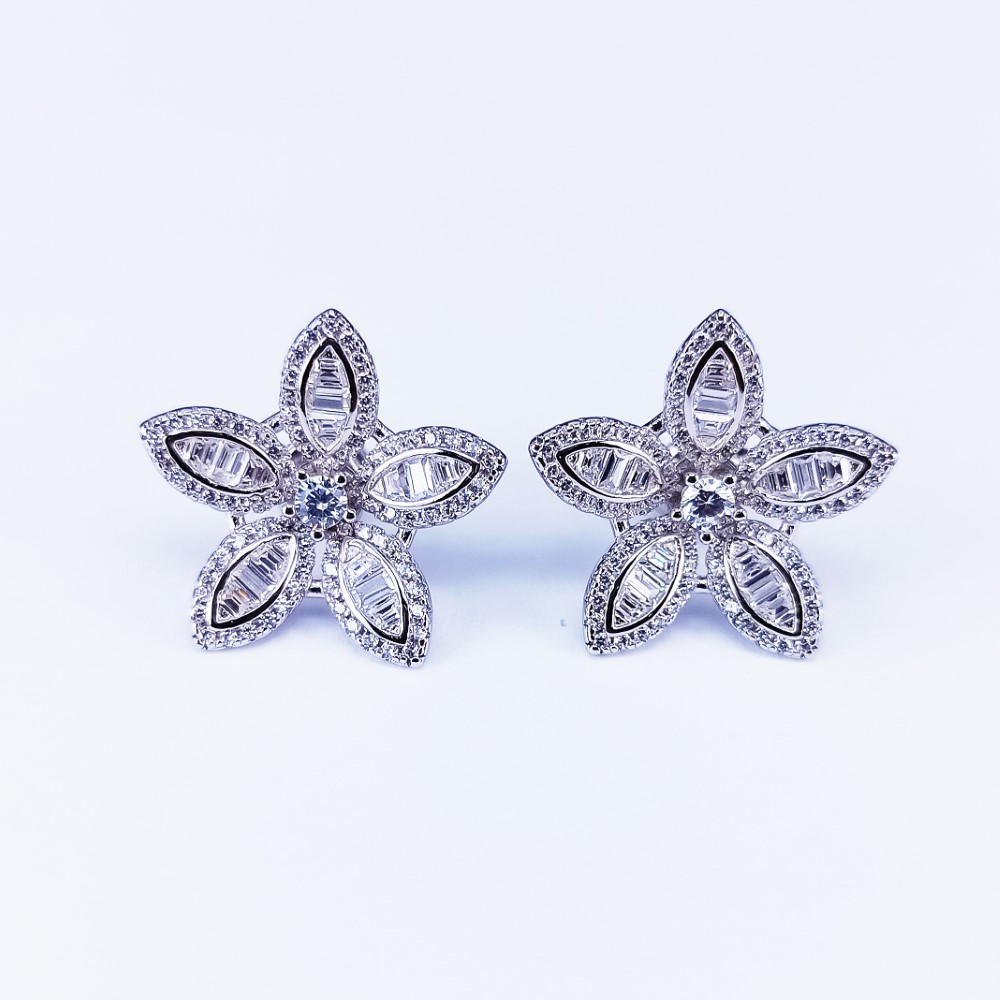 Genuine Sterling Silver tops earrings in Daisy pattern set with round and baguette shaped Cubic Zirconia set in Channel and Pavé style setting. Electroplated with Rhodium.