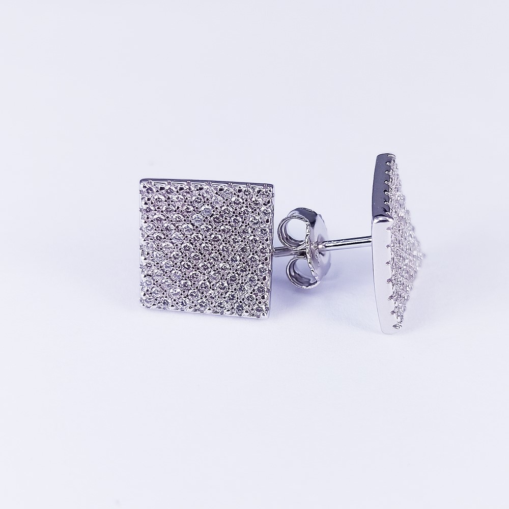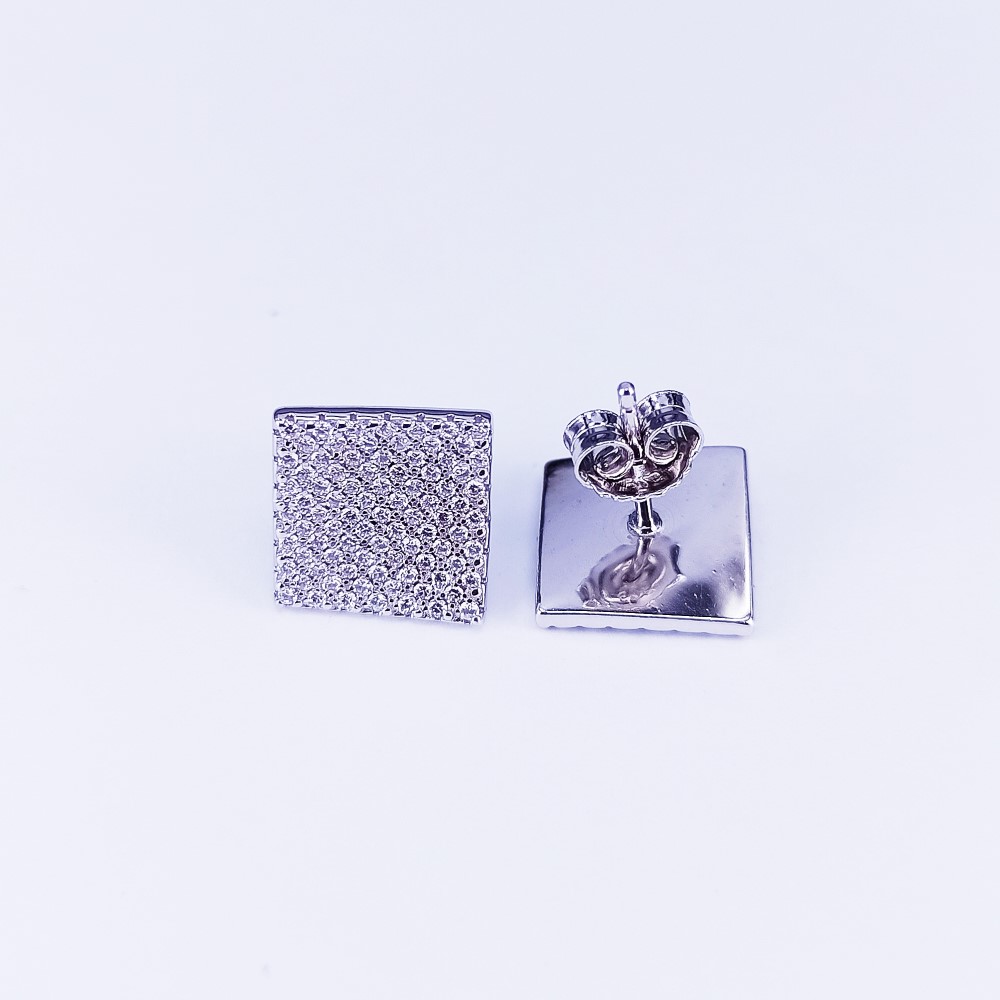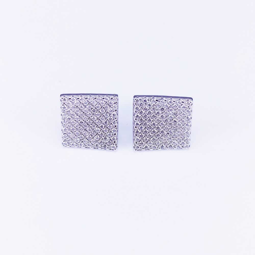 These square shaped tops earrings feature a wavy design and set with cubic zirconia in a pavé style manufactured in genuine sterling silver. Electroplated with Rhodium.